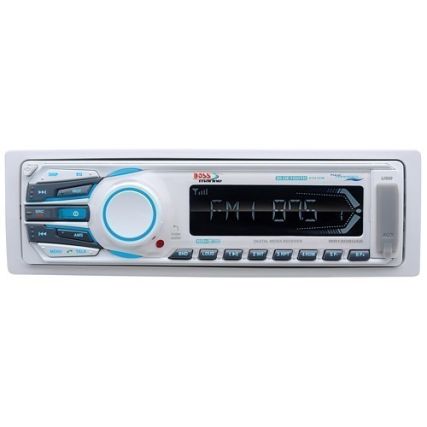 The Boss MR1308UAB marine digital media receiver is designed for marine use, with a UV-resistant exterior that resists fading and a conformal-coated PC board that resists corrosion. It blends into most boat interiors and offers an impressive list of features.