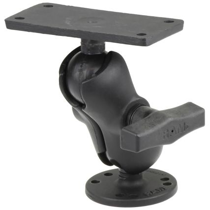 The RAM-202-24-B-202U, powder coated marine grade aluminum mount, consists of a short double socket arm mount, one round 2.5″ diameter round base with the universal AMPS hole pattern and one 2″ x 4″ rectangular base. The unique rubber ball and socket technology dampens shock and vibration while offering high adjustibility to achieve the perfect viewing angle.