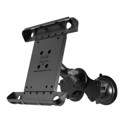 The RAM-B-189-TAB3U consists of a double 3.3″ twist lock suction cup base, double socket arm, round base adapter and Tab-Tite™ universal clamping cradle. The suction cup base is designed to have a strong hold on glass and non-porous plastic surfaces. The mount is designed with a RAM 1″ diameter patented rubber ball and socket system that has adjustment points at both ends of the double socket arm; this allowing for almost infinite adjustment and perfect viewing angles. The spring loaded Tab-Tite™ cradle makes it easy to load and unload your tablet, along with keeping it secure while on the go. Interchangeable cup ends are designed to optimize the functionality of your tablet, allowing access to audio jacks, usb, power, and other ports, your tablet can be used just as it was intended.