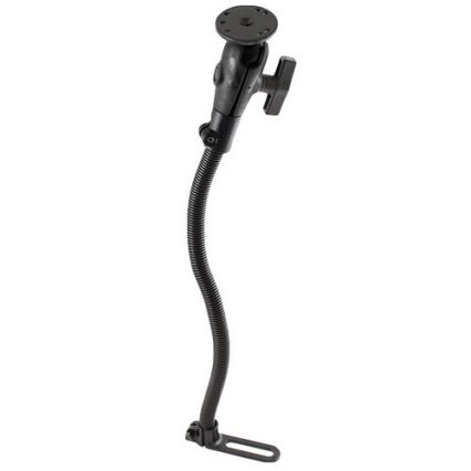 At right angles to the base of the flexible 18″ long leg is a foot with a mounting hole. Simply place the hole into the passenger seat mounting bolt and adjust the mount to the required height with the flexible leg. The rigid flexible arm will hold everything you need safely and securely.