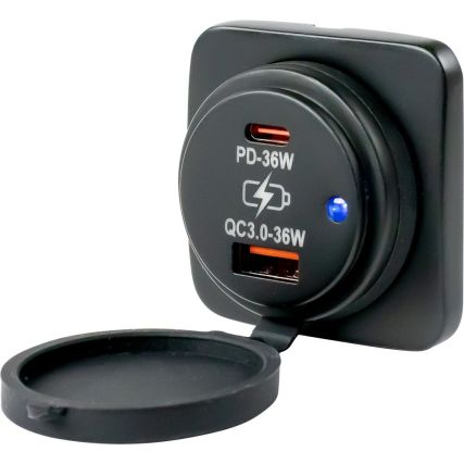 This square surface-mount USB 3.0 & USB-C power socket charges two devices simultaneously. When split, the total 6A output is 3A per side.